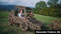 Borderline Car, a vehicle made from twigs and branches by a Russian artist couple who work under the name “porcupine.”