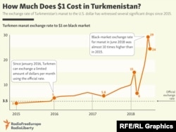 The unofficial exchange rate for the dollar has skyrocketed since the beginning of the year, from about 10 Turkmen manats to the U.S. dollar to 29 manats to the dollar on June 3. The government has stubbornly kept the official rate at 3.51 manats since 2015.