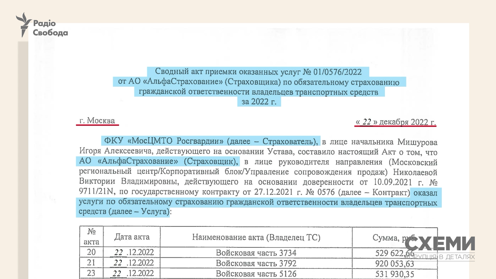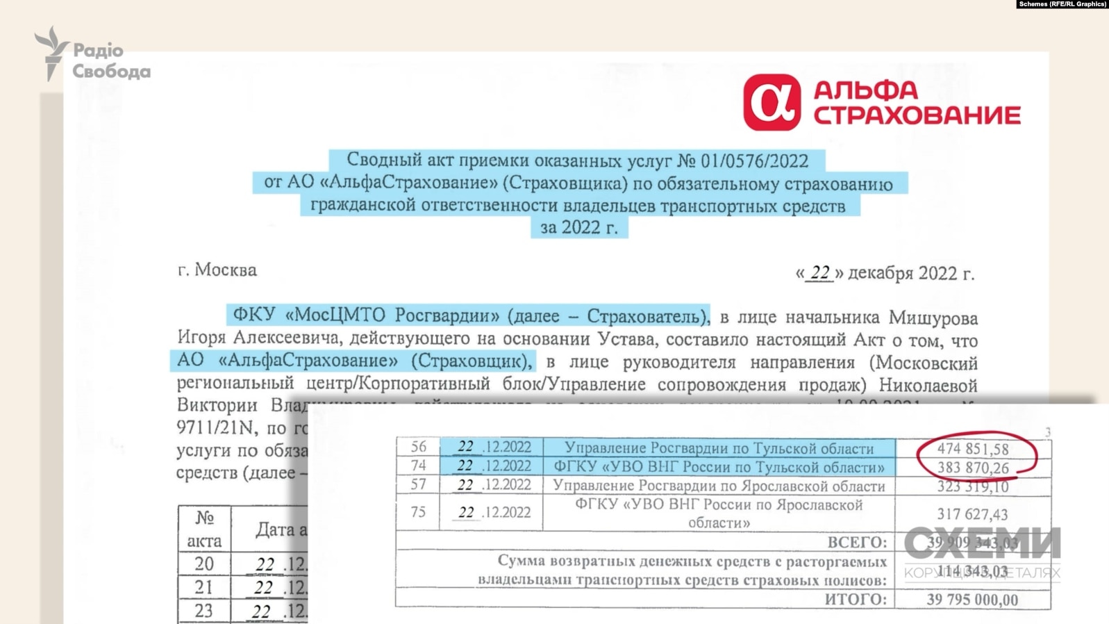 A series of official documents that confirm that a government client has received contracted services from a provider, known as Acts of Provided Services, shows that the Russian National Guard has ranked as one of AlfaStrakhovanie’s largest government clients since 2018, with over 280 million rubles ($3.5 million) in vehicle insurance policies.