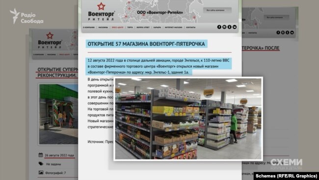 A joint venture between the X5 Group’s Pyatyorochka chain of hypermarkets and the Russian Defense Ministry’s Voentorg, which outfits and feeds Russian troops and manufactures Z-emblazoned T-shirts, has expanded since the 2022 fighting began. In August 2022, the 57th Voentorg-Pyatyorochka store opened in the Volga River city of Engels, the site of an air force base from which heavy Russian bombing raids against Ukraine regularly depart.