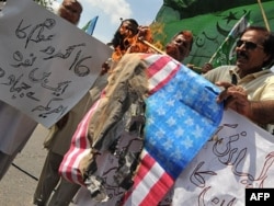 A Pakistani holds a burning U.S. flag during a protest in Lahore following a drone attack that killed five people.