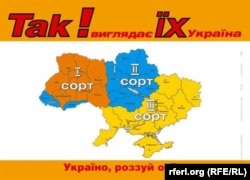 A poster for the 2004 Ukrainian presidential election, emphasizing interregional differences in the country.