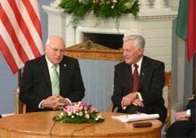 "The world knows what is happening in Belarus," Cheney said. "Peaceful demonstrators have been beaten, dissidents have vanished, and a climate of fear prevails under a government that subverts free elections and bans your own country's flag. There is no place in Europe, whole and free, for a regime of this kind."