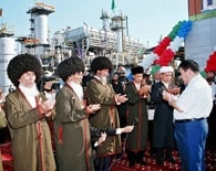 Turkmen President Saparmurat Niyazov prays with religious leaders at the opening of a new gas compressor station in 2005 (ITAR-TASS)