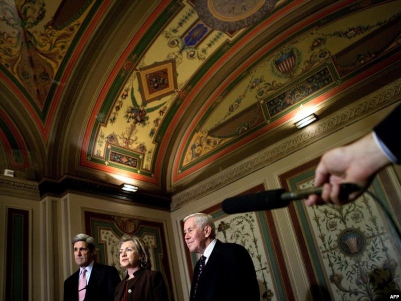 U.S. Senator John Kerry (left) and Senator Richard Lugar (right) and Secretary of State Hillary Clinton meet to speak about the New START, a nuclear disarmament treaty between the United States and Russia.