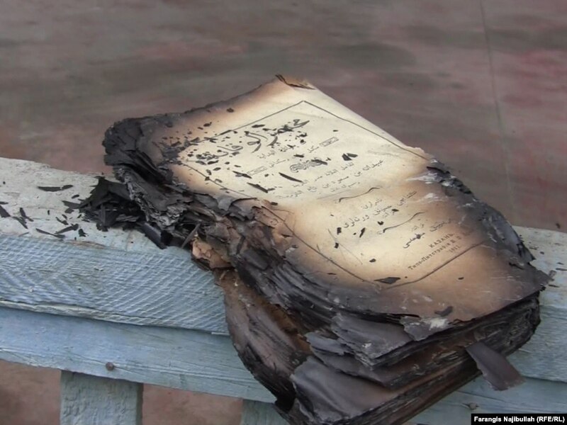 A young boy from a neighboring house showed us a burned copy of the Koran, saying he had recovered it from the ruins of the house.