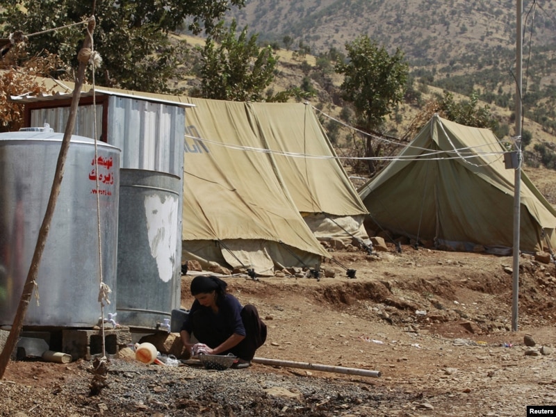 A woman washes dishes at a refugee camp near Qandil Mountain, a border zone in northeastern Iraq where Kurds have fled offensives in Turkey and Iran.