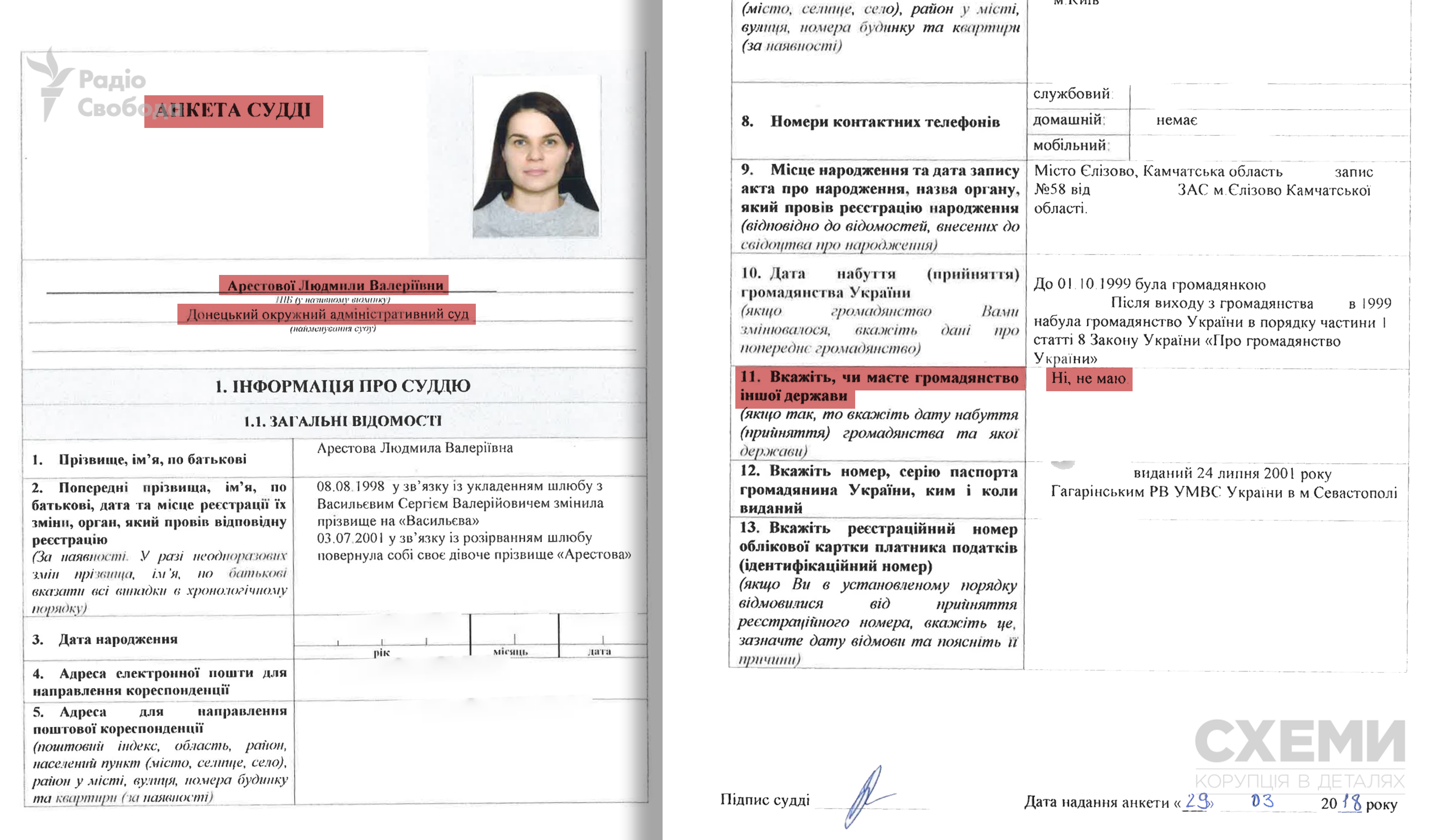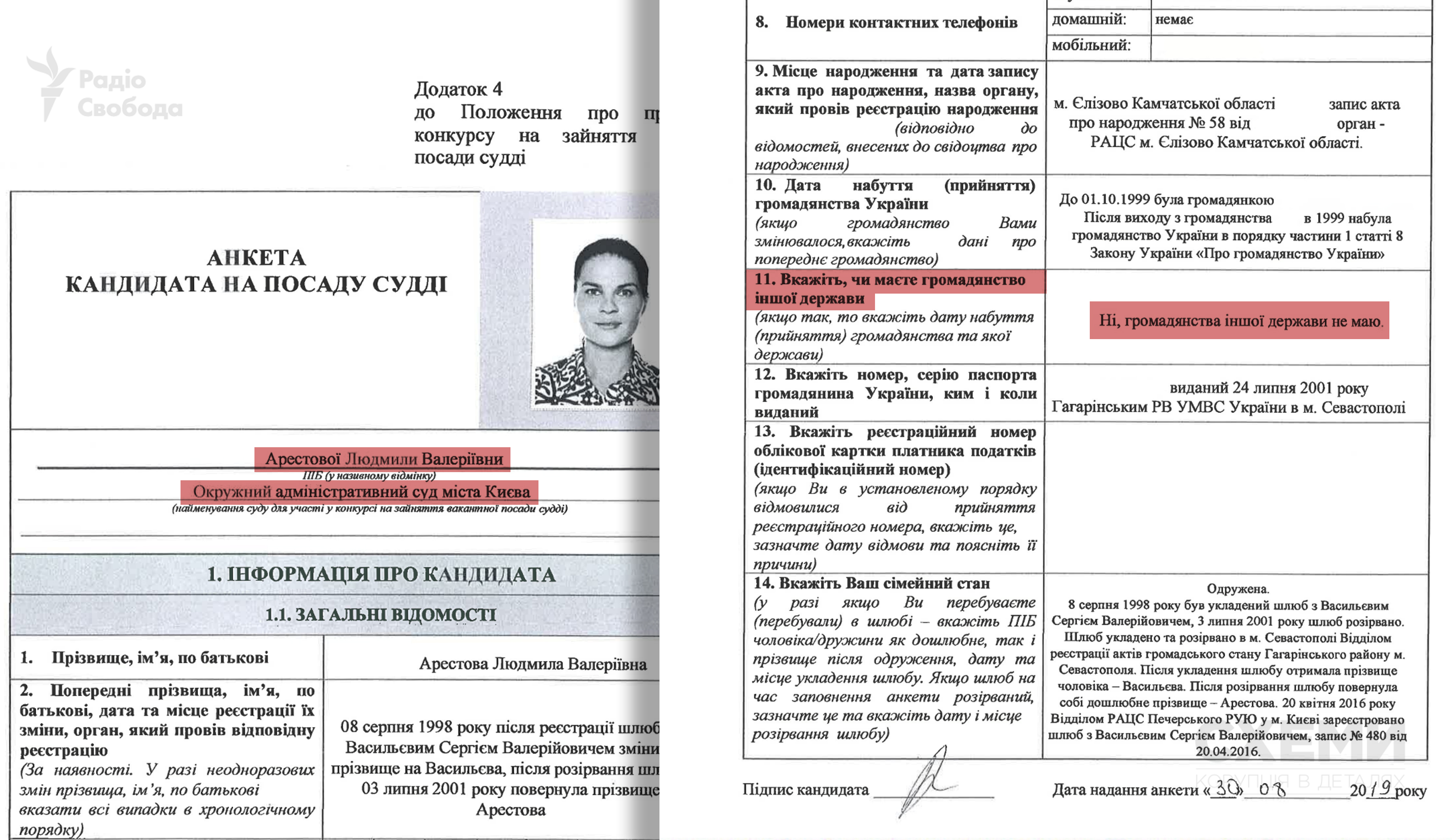 In a 2018 professional assessment, Arestova denied to the Higher Qualification Commission of Judges, the Ukrainian judicial system's standards body, that she had foreign citizenship. She repeated that denial in a 2019 application for a judgeship on the Kyiv district Administrative Court.