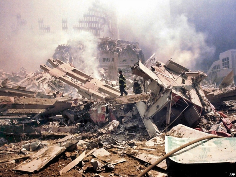 Firefighters walk amid the smouldering rubble of the World Trade Center following the terrorist attacks in New York of September 11, 2001.